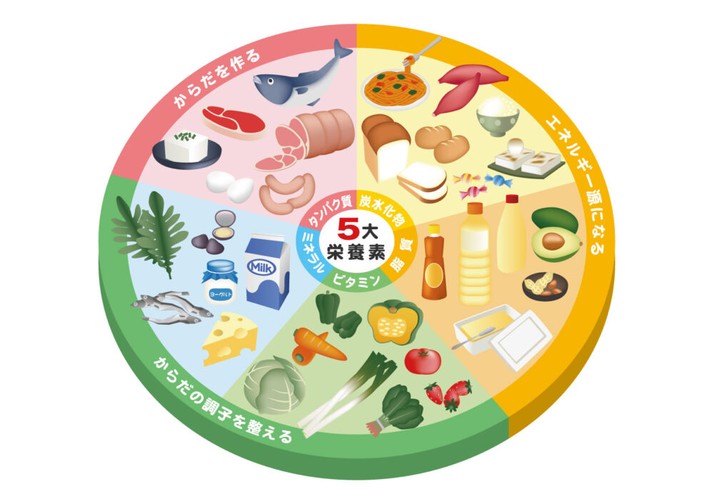 私たちの体は、エネルギー源となる3つの主要栄養素(マクロ栄養素)と、それらを効率よく機能させる2つの微量栄養素(ミクロ栄養素)の合計**「5大栄養素」**で支えられています。